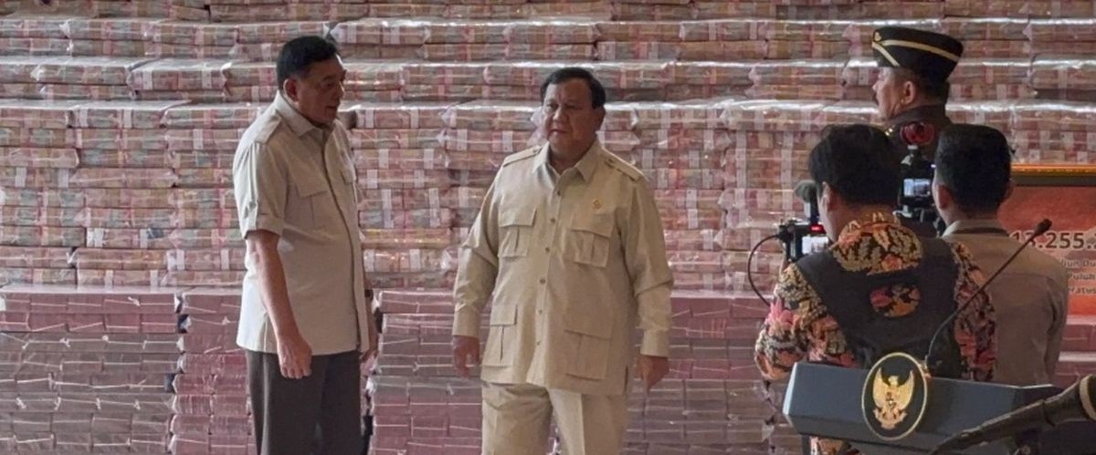 Sebelum acara itu dimulai, Prabowo juga terlihat berbincang bersama anggota kabinetnya. Mereka berbincang tepat di depan tumpukan uang tersebut.